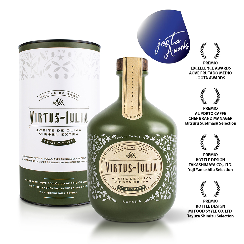 Virtus Iulia como proyecto de diseño de packaging para aove, en su primer año de vida ha sido galardonado con 3 premios de diseño de envase. Medalla de oro en LAIEVOOC 2022 (Los Ángeles, USA) al mejor diseño del concurso elegido por el jurado y estos dos premios Bottle Design en los Joota Awards (Tokio, Japón) uno de ellos en solitario en la categoría.