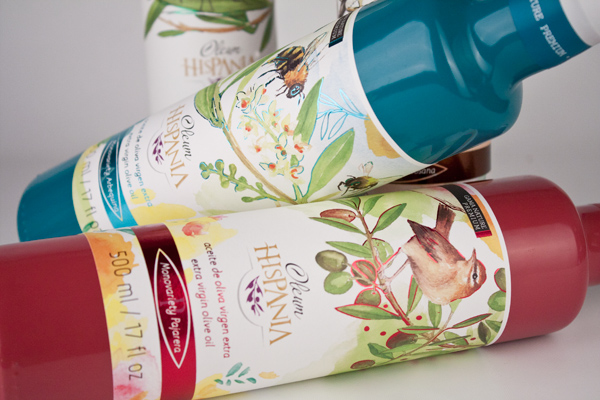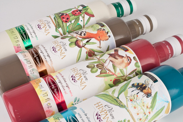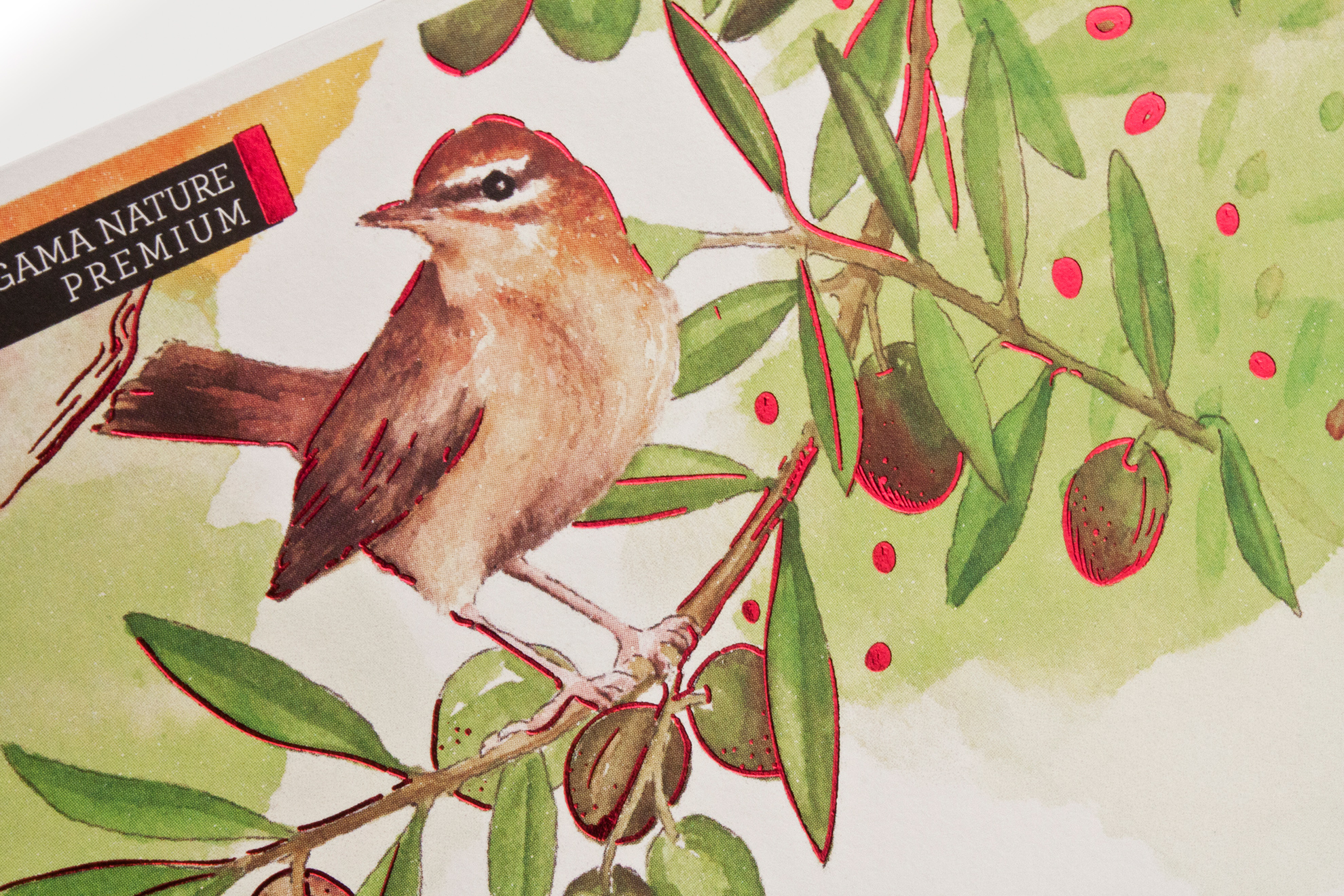 Oleum Hispania en su gama de “Aceite de Oliva Virgen Extra” quería tener presente a la fauna beneficiosa del olivar. Para eso creamos la “Gama Nature Premium” y para ella realizamos una serie de ilustraciones ex profeso para la misma. Con la técnica de la acuarela con lápices hicimos realidad la idea de llevar la fauna del olivar al diseño de packaging de esta gama.
