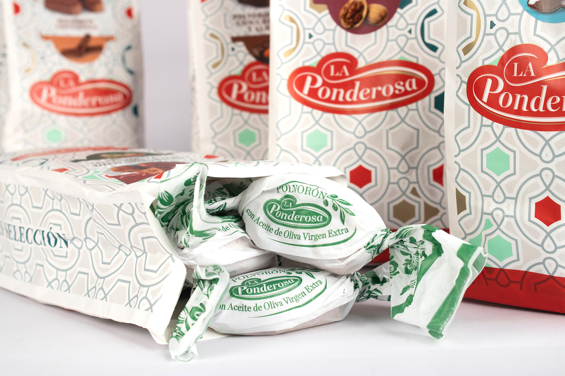 El papel es otro material reciclable y biodegradable utilizado en el packaging sweet. Es un material ligero y flexible, lo que lo hace ideal para envueltas de dulces individuales. Para contacto con alimentos grasos el papel del packaging deben ser parafinados con cera de abeja para conseguir que sea biodegradable y compostable. Si el alimento o producto no es graso podemos utilizar papel sin tratar o papel reciclado ambos biodegradables y compostables. La mayoría de los papeles que se fabrican actualmente son FCC libres de cloro en su fabricación.El diseño gráfico del packaging en papel puede más «eco» creando piezas a un solo color y donde la carga de color ocupe la menor extensión posible.Para ello, se deben utilizar en la impresión tintas biodegradables hechas a partir de materiales naturales o renovables. Cualquiera de las soluciones que ofrece el mercado, tintas a base de agua, soja, aceite vegetal o de resina valen. Para contacto con alimentos se recomiendan las tintas a base de soja. En este ejemplo de packaging flexible de la línea de bolsas de La Ponderosa las bolsas están realizadas en papel totalmente biodegradable y dirigidas a los consumidores más «ecofiendly».