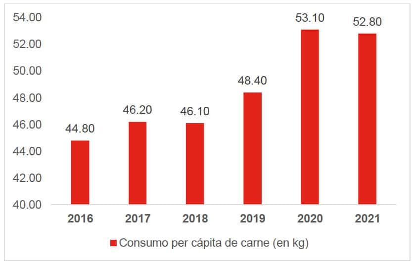 Como ya se ha mencionado, el sector cárnico tiene una gran importancia en la República Checa. Entre los países del mundo, Chequia ocupa el 30.º puesto en consumo anual de carne. La demanda de productos cárnicos, tanto frescos como procesados, ha aumentado en el último lustro. En el gráfico siguiente se muestra la evolución del consumo per cápita de carne en la República Checa en 2016-2021.