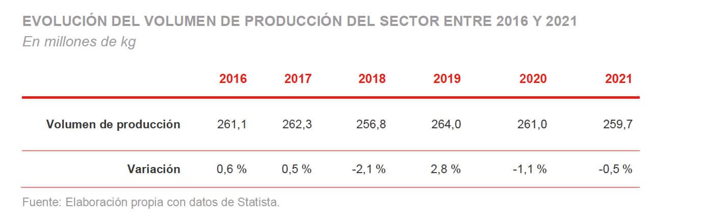 EVOLUCIÓN DEL VOLUMEN DE PRODUCCIÓN DEL SECTOR ENTRE 2016 y 2021 en millones de kg