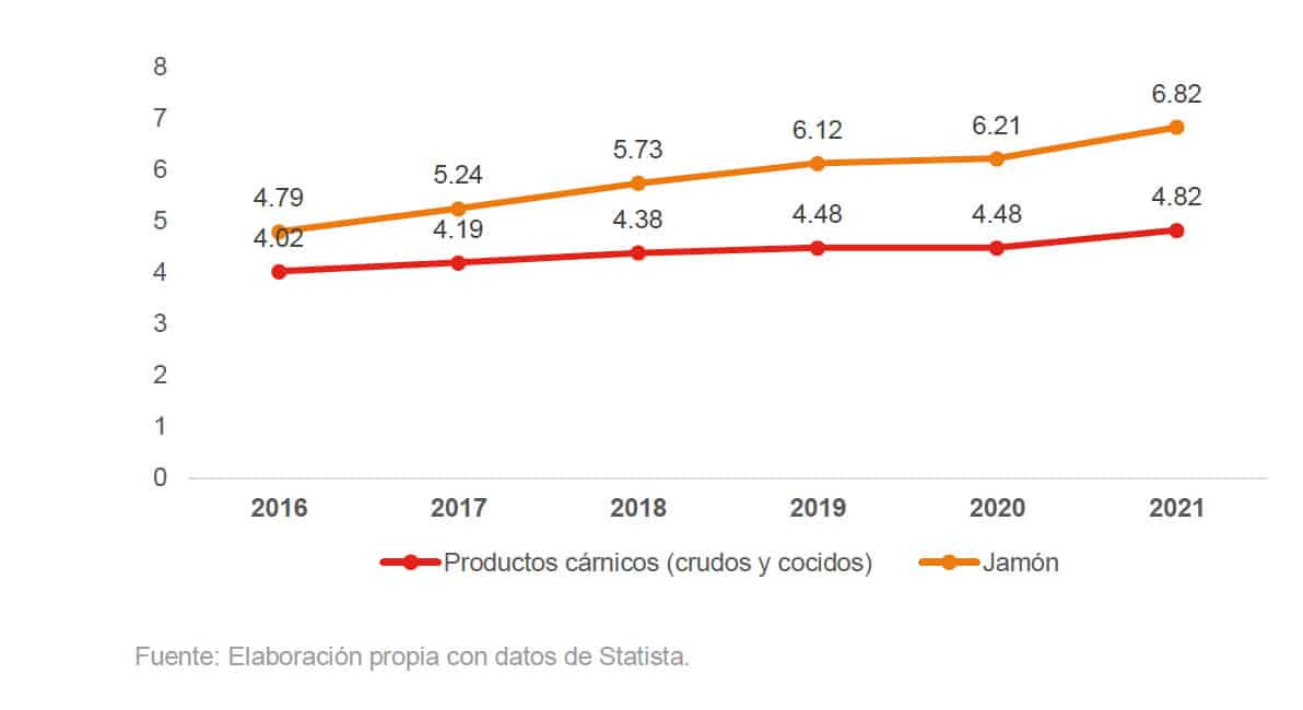2016. Este incremento fue del 129 % en la partida 16.01, y del 348 % en la partida 16.02. En 2021, el valor de las importaciones de jamones y embutidos desde España ascendió a un total de 10,399 millones de euros, lo que supone un aumento del 156 % con respecto a la cifra