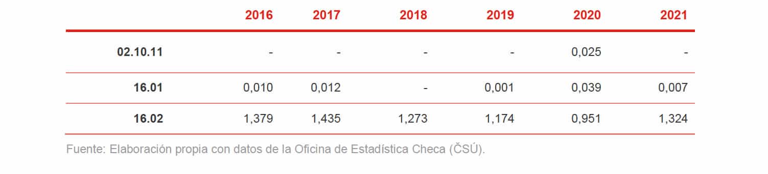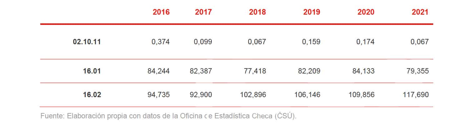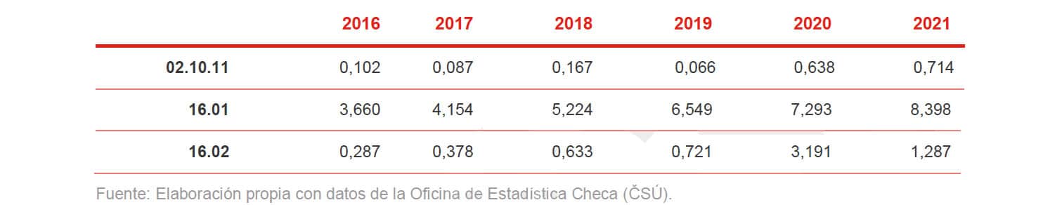 En 2021, el valor total de las importaciones de este sector según las partidas arancelarias seleccionadas fue de 186,009 millones de euros, y el de exportaciones, 197,112 millones de euros. Por lo tanto, la balanza comercial checa fue positiva.