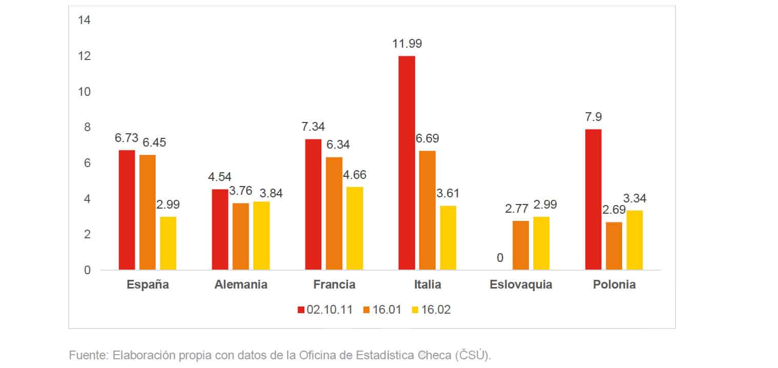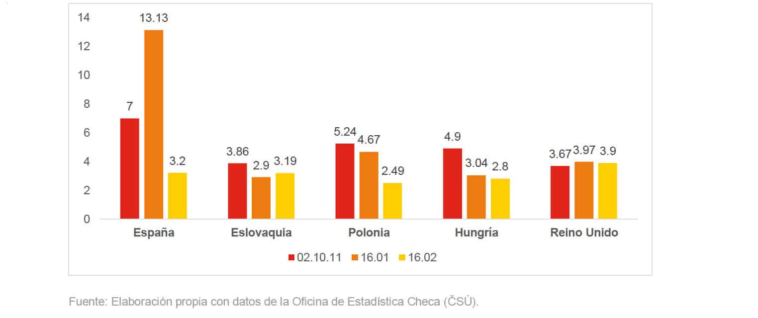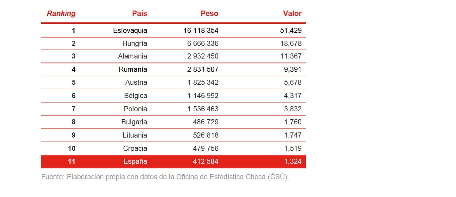Como se observa en las tablas, predominan las importaciones de países de la Unión Europea. Los puestos en los rankings varían según las partidas arancelarias. España es el principal exportador de jamones de la partida 02.10.11 a la República Checa, con una cuota de mercado del 60,87 %.