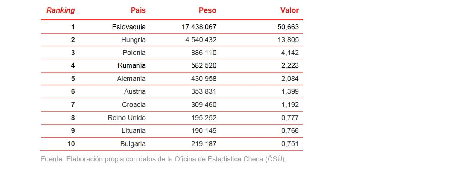 REPÚBLICA CHECA EN 2021 Por países de origen, en kg y millones de EUR