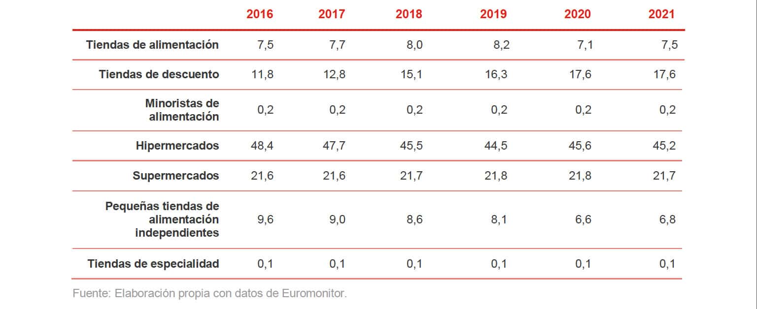 La siguiente tabla muestra las principales empresas de alimentos procesados que operan en la República Checa, incluyendo la evolución del porcentaje de su cuota de mercado.