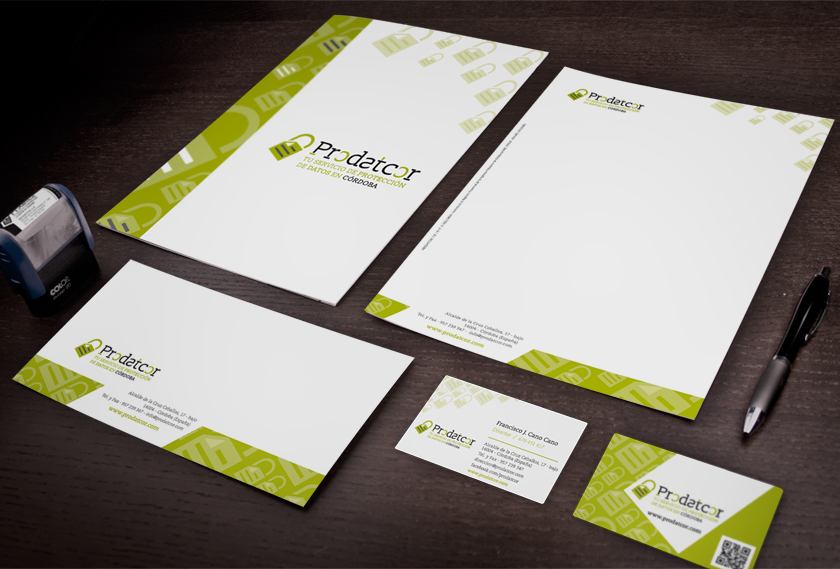Prodatcor ofrece un servicio profesional, con garantía en la calidad e implantación del mismo. El diseño gráfico de la imagen corporativa evoca mediante el símbolo del candado sobre el icono de un fichero, la garantía y seguridad de sus servicios. Hemos pretendido darle un carácter más tecnológico con la utilización de una tipografía serifa que hemos retocado con aspecto de pixelada y la utilización de un segundo color verde más tecnológico.