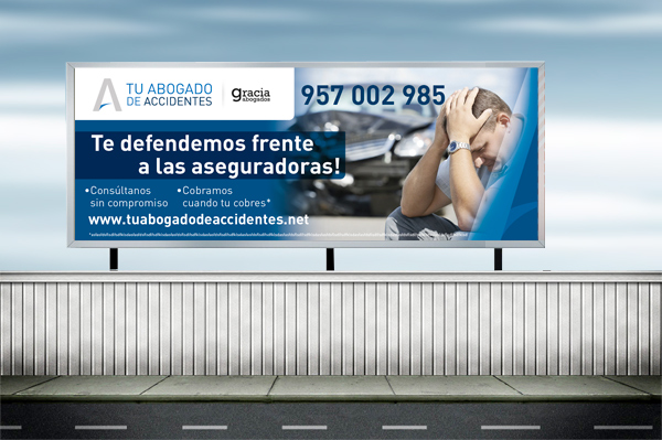 Creamos un claim de comunicación «Te defendemos frente a las aseguradoras» que ira unido a la marca en toda la comunicación y es nuestro mensaje principal. Este slogan define claramente el servicio que prestamos a nuestros clientes y nuestra especialización. En la publicidad exterior y en el servicio web utilizamos un mensaje secundario «Cobramos cuando tu cobres» .