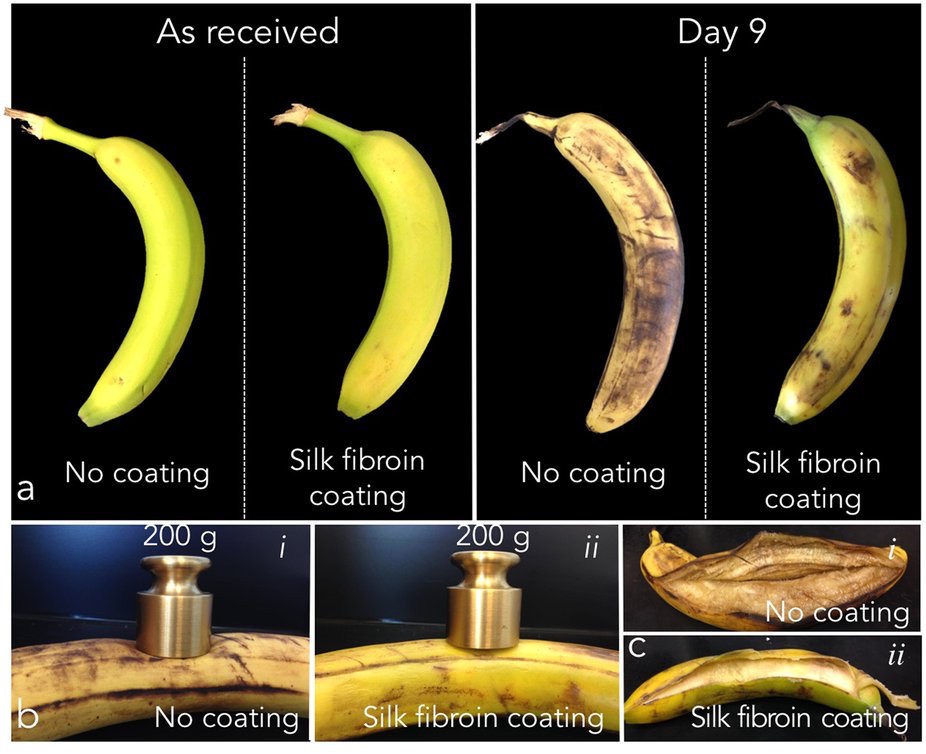 Después de nueve días, la carne de los plátanos recubiertos seguía siendo blanca, sabrosa y fuerte. Cuando los investigadores colocaron un peso 200 gramos por encima de los plátanos, no se hundió en los plátanos recubiertos con fibroína, pero fue derecha a través de la carne del plátano en los no recubiertos.