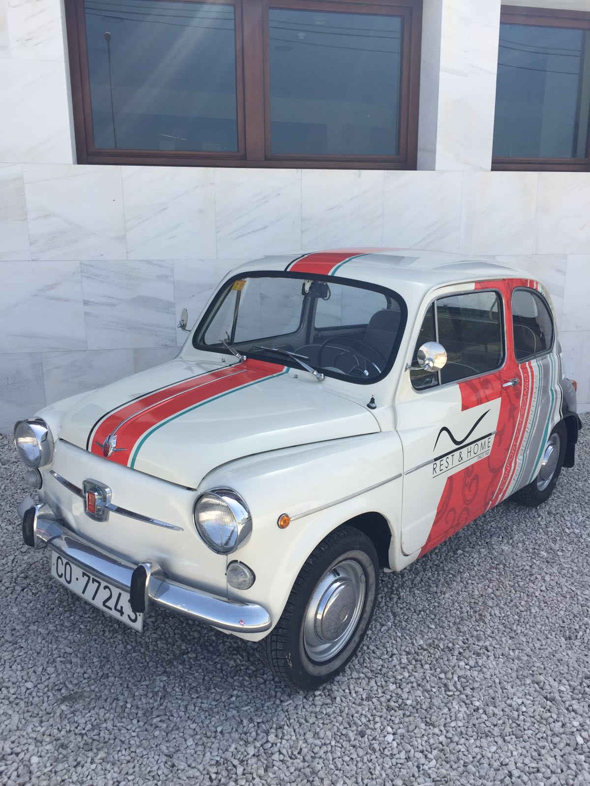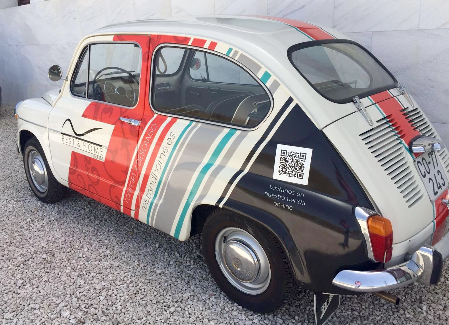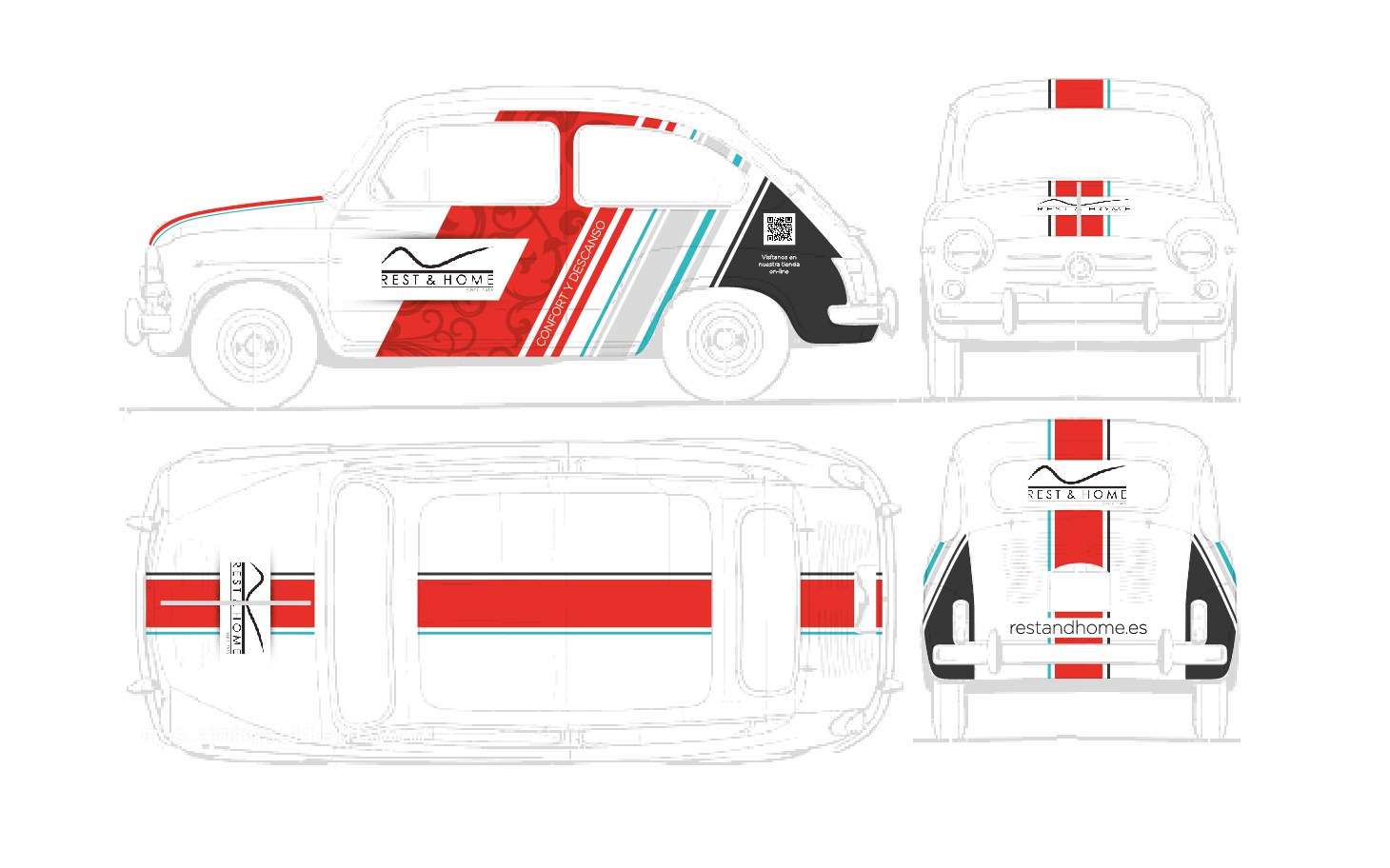 Para añadirle un aspecto más actual hemos aplicado un diseño vintage en el tercio delantero, sobre las puertas del conductor y acompañante donde insertamos la marca de Rest&Home. Hemos aplicado negro en el cuarto posterior del coche sobre la aleta de la rueda soportando el código bidi o QR de la web.