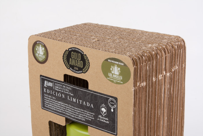 Este proyecto no es premiado por casualidad, su diseño de packaging es pura potencia y está posicionando a la marca como líder en su segmento, siendo una llamada de atracción hacia los clientes de la marca. El formato de la botella, su terminación y un cuidado estuche cuyas láminas de cartón se han montado a mano, una a una, dejando ver en todo momento la botella es determinante. Este envase edición limitada es la representación de la esencia premium en el sector del AOVE.