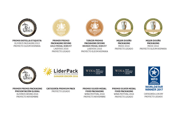Nuestros diseños de packaging de aceite acumulan con este, 10 premios nacionales e internacionales en diferentes concursos: