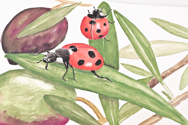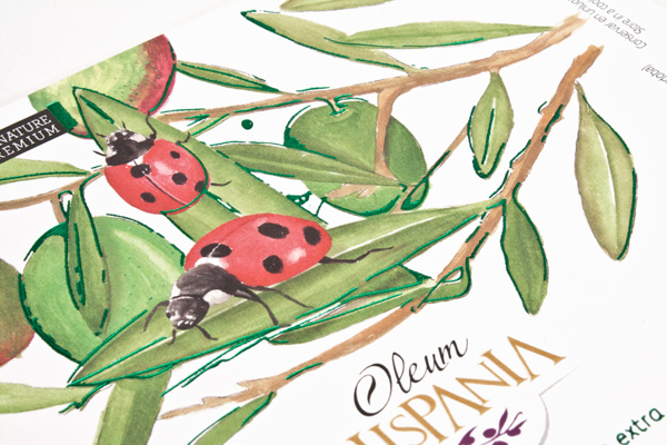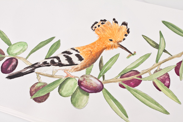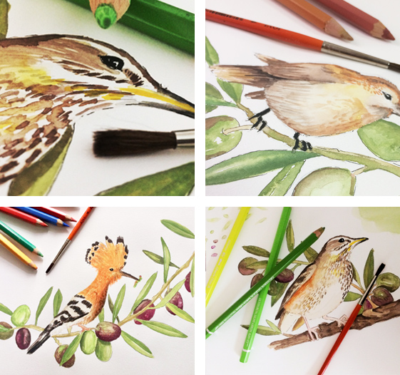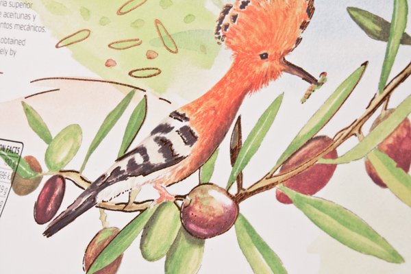 Realizamos un listado de la fauna del olivar y dibujamos a mano una serie de bocetos rápidos. En acuarela, sobre diferentes animales característicos del olivar. Seleccionamos junto con el cliente cuatro, una abeja, una mariquita, una abubilla y un alzacola. Que se corresponderían con los aceites de oliva monovarietales que se iban a producir aberquina, arbosana, hojiblanco y picual. Dos aceites suaves y dos muy potentes con los que finalizamos las acuarelas definitivas.