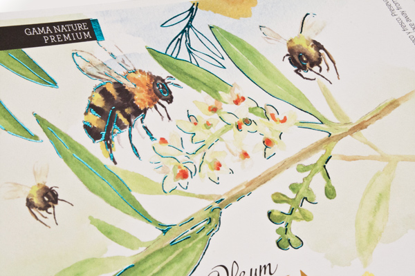 Elegimos esta técnica de dibujo pues queríamos aportar color, pero transferirlo a la etiqueta de una forma elegante. Utilizando un papel de base enológico que nos aportará un tacto suave al coger la botella. Y por lo tanto, en el que la acuarela con tonos suaves y pasteles no se perdieran.