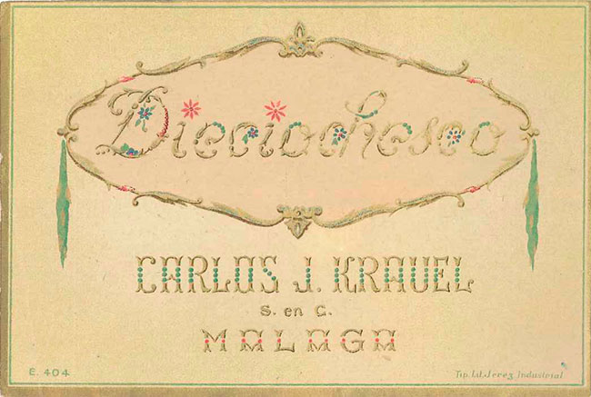 “Vinum de Vite”; una especialidad con destino a la liturgia de la eucaristía donde las Bodegas Carlos J. Krauel fueron muy reconocidas. Muchas de estas ilustraciones y litografías de etiquetas fueron realizadas por la ya desaparecida Jerez Industrial líder en la producción de etiquetas de la época y cuya firma aparece en muchas de las mismas.