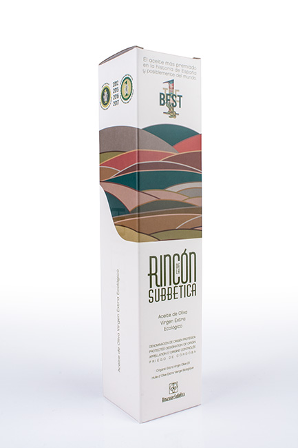 Como última fase del proyecto hemos diseñado el estuche de presentación. En el que hemos adaptado el concepto de la etiqueta de Rincón de la Subbética en cuanto a su estructura. A esta presentación le hemos incorporado un sello en la parte superior de su cara frontal Best One con la leyenda «El aceite más premiado en la historia de España y posiblemente del mundo».