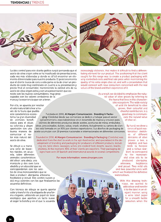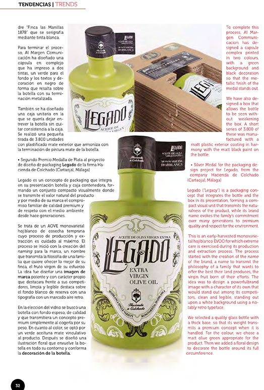 Con una extensión de aproximadamente 6 páginas dedicadas exclusivamente a hablar de los tres proyectos de diseño para aceite de oliva, Infopack explica el concepto creativo de cada uno y todos los detalles de como realizamos los tres diseños de packaging, además han tenido la amabilidad de realizar un resaltado sobe Al Margen Comunicación.