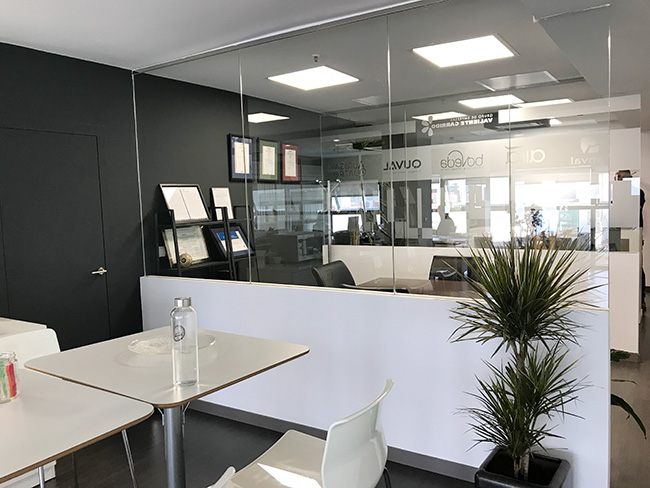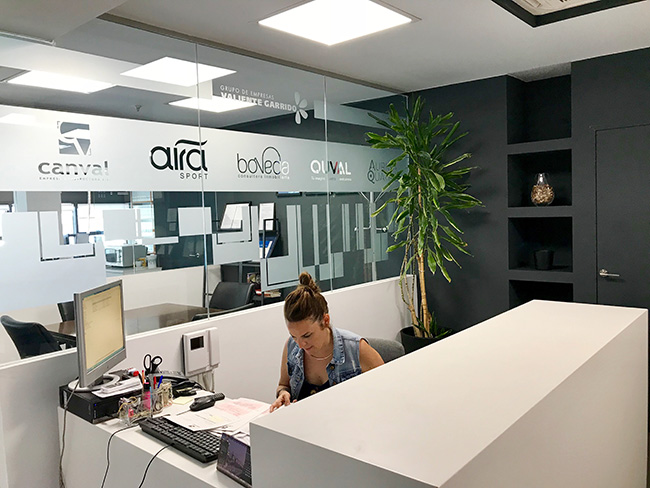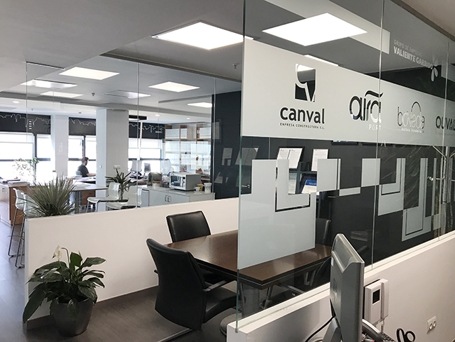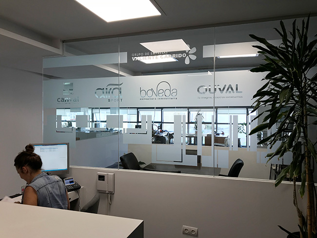 Os mostramos el montaje y el resultado final. Dentro del encargo realizamos la señalética de las oficinas en el edificio y la tematización de la recepción de las oficinas sobre muros de vidrio mediante vinilos al ácido.