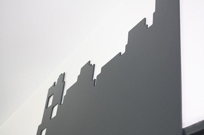 La solución que aportamos fue diseñar un frontis formado por dos piezas, que al unirse forman un skyline de edificios relacionado con la temática principal del grupo. Este frontis se ha realizado en pvc y se ha terminado aplicándole el mismo RAL de la pintura metalizada del cierre un gris antracita, de forma que continua el conjunto visual con la carpintería metálica.