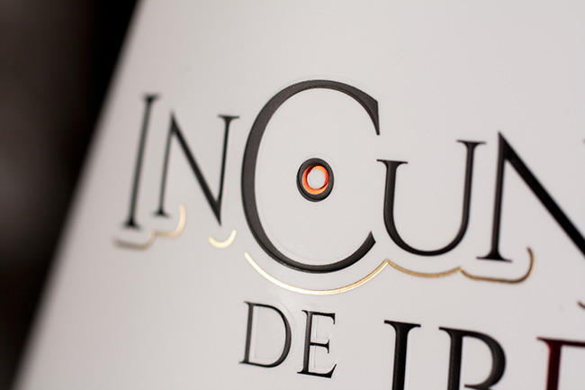 Por un lado hemos utilizado estampación por calor en los líneas y filetes oro junto con la estampación por calor del rojo consiguiendo un efecto metalizado en la vitola y marca sin perder legibilidad por su efecto. Sobre la marca «Incunable de Ibesa» y su símbolo hemos aplicado además un golpe en seco que levanta visualmente y al tacto a la misma. La denominación de producto la enmarcamos sobre una pastilla negra identificadora de la categoría del mismo y que destaca la tipografía limpia calada en blanco.