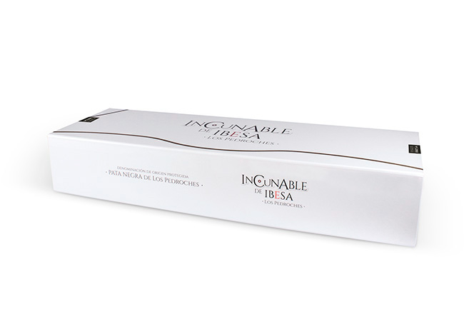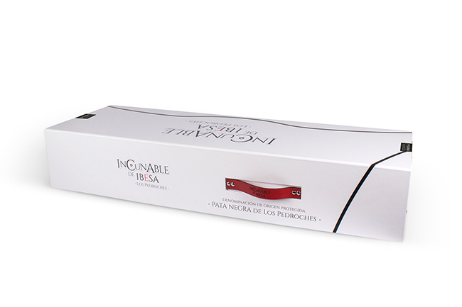 El jamón se presenta en una caja jamonera con terminación premium. Envuelto en papel sulfurizado plata sin impresión, con una etiqueta en forma de ovalo que ejerce a la vez de cierre y precinto de garantía colocado sobre la zona del hueso. La etiqueta mantiene la línea de imagen con la estampación por calor en el rojo de la «E» y el circulo de Ibesa. La cuerda en color plata se une al conjunto formando un todo.