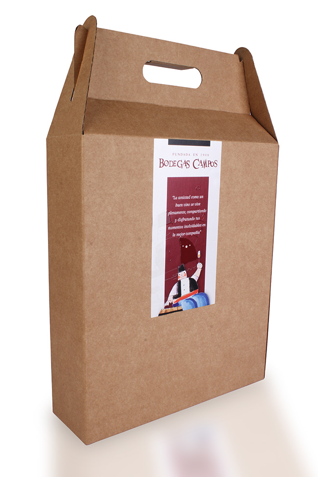 Aquí podéis ver un ejemplo con este modelo de caja con terminación color kraff que hemos personalizado para regalos a Bodegas Campos. La caja es auto montable y os llega plegada para montar, en función de los modelos elegidos tienen más o menos dificultad en su montaje.