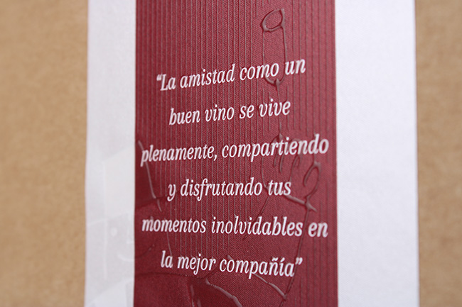 Sobre la etiqueta hemos creado una leyenda para hacer que nuestra caja de regalo valga para cualquier ocasión y no sea una caja estacional sólo para navidad. El texto de la leyenda une el regalo a los conceptos de amistad, la forma de disfrutar un vino (producto relacionado con la marca), compartir y disfrutar, con la marca y su logo «El Gordito»