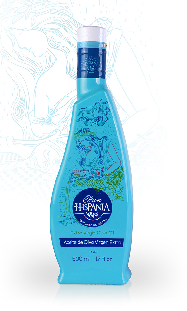 El diseño de la ilustración aporta el color necesario con la utilización de 4 colores. Dos azules uno tenue muy claro y otro mas añil que marcan lo hídrico dentro de la escena. Un verde oliva para olivos y aceite y un fucsia que perfila la parte humana de la figura y el envero de las aceitunas. Todos estos colores resaltan sobre la botella de vidrio personalizada que hemos pintado en azul celeste con terminación cerámica, muy identificativa del elemento de la gama que se representa.