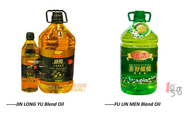 * El primer tipo es el de las empresas chinas del sector de la alimentación que importan aceite de oliva a granel que se envasa en China y se vende bajo una marca de su propia creación (con aspecto de ser aceite extranjero). Además este tipo de aceites van acompañados en China de muy fuertes campañas de marketing, este ha sido uno de los factores clave en el ascenso de aceites como por ejemplo “Olivoilà”. Ya están presentes en todos los segmentos, distribución, regalo y horeca con presentaciones y formatos en los distintos posicionamientos. El diseño deja mucho que desear en el segmento premium (se nota mucho que es un producto chino) en el segmento mas comercial de gran distribución si lo tienen muy conseguido visualmente.