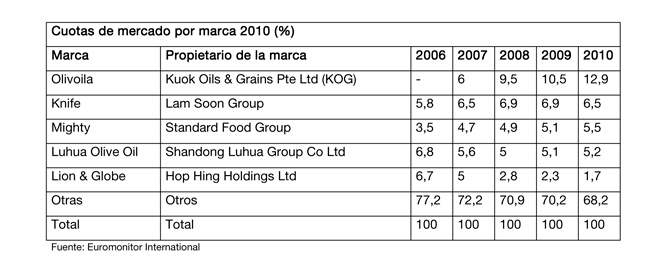 La gran mayoría de las grandes marcas de aceite internacionales ya están presentes en el mercado. Aún así nuevos entrantes de los principales países productores siguen los pasos de las grandes marcas. El consumidor chino puede elegir aceite de oliva de entre 86 marcas diferentes. Sin embargo, sólo 7 de ellas tienen una presencia consistente y extendida en el mercado chino. De estas, 4 son marcas españolas. El factor que más ha afectado a la evolución de las marcas durante los últimos años ha sido el distribuidor. Marcas que entraron en el mercado hace varios años y que han conseguido crecer junto con el distribuidor, actualmente gozan de una situación privilegiada para continuar la lucha por el mercado. En cambio, las que por diferentes circunstancias tuvieron que cambiar su distribuidor se han encontrado con importantes retrocesos frente a sus competidores. El distribuidor sigue siendo la variable fundamental para entrar en el mercado y asentarse. Encontrar un buen socio-distribuidor es actualmente una de las principales barreras de entrada al mercado, y dicha barrera es aún mayor para entrar en distribuidores que sirven a las grandes cadenas de hipermercados y supermercados. La competencia de envasadores chinos es intensa en todos los segmentos de aceites de oliva, y está previsto que siga creciendo conforme el mercado evolucione. Las empresas chinas juegan con tres variables fundamentales a su favor: una cartera de productos diversificada, redes de distribución asentadas y conocimiento del mercado. Durante los próximos años se puede esperar mayor competencia tanto por parte de las marcas actuales de grandes grupos de alimentación chinos como de nuevos entrantes conocedores del sector. En el siguiente cuadro se puede observar las cuotas de los principales aceites de oliva vendidos en el mercado chino (los aceites de oliva de marca extranjera están recogidos en el epígrafe otros):