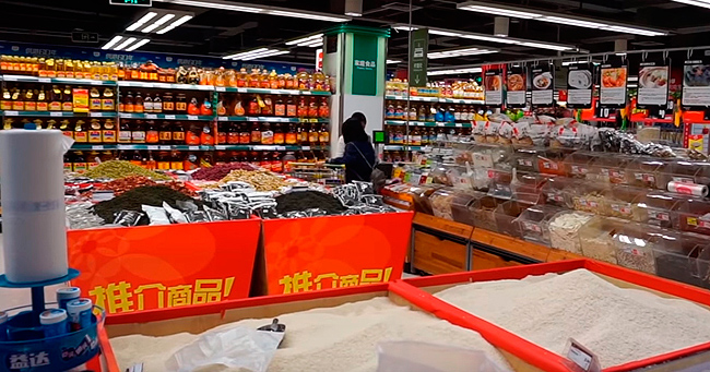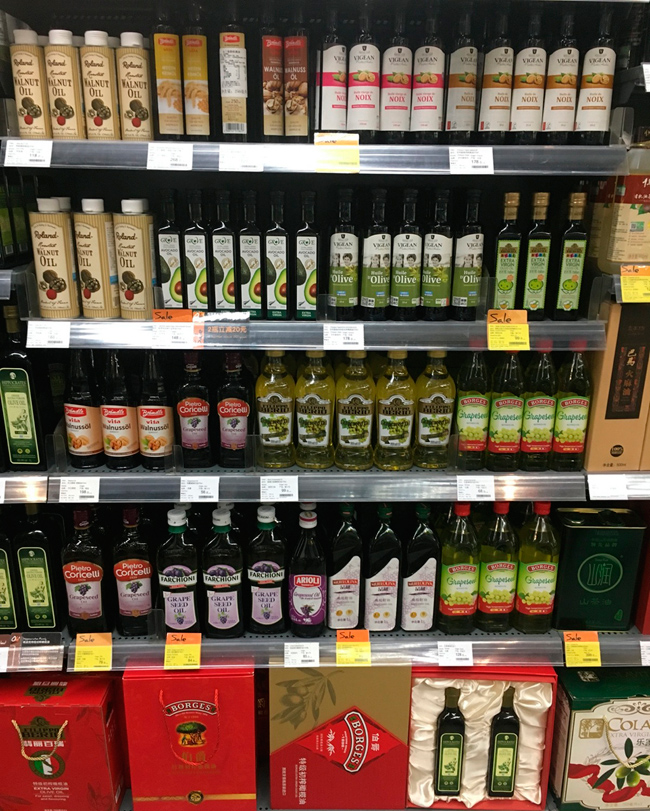 Supermercado en China, al fondo lineal de aceites gran presencia de aceites vegetales de distintas procedencias y marcas.