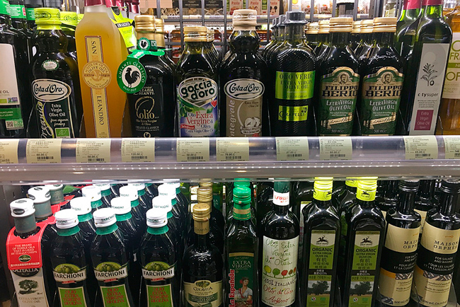 Muy curioso como marcas de aceite chino Olivoilà reenvasados se mezclan con los aoves de procedencia europea mimetizándose perfectamente en el lineal de aceites de oliva como un europeo más.