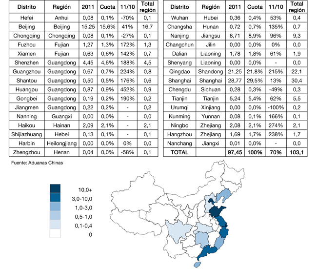 Por este mismo motivo los aceites de origen vegetal son los claros dominadores del mercado en contraste con algunos países occidentales en los que la mantequilla y margarina tienen un protagonismo mucho mayor. A pesar de que en China se planta olivo desde hace décadas, la producción local de aceite de oliva es aún insignificante. China cuenta con 20.000 ha. de olivar de distintas variedades, muchas de las cuales se usan para la elaboración de aceitunas secas consumidas como snack en China. El aceite de oliva que se consume en China por tanto es importado. En 2011 China importó en total 32.886 toneladas de aceite de oliva, un 55% más que el año anterior. En cuanto a datos en valor, los datos siguen una tendencia similar a los datos en volumen, pero muestran un crecimiento superior. En 2011, China importó aceite de oliva por un valor total de casi 101 millones de euros, un 60% más que en 2010. Tomando las importaciones bajo el TARIC 1509 (aceite de oliva), España es líder de mercado con un 57,8% de cuota en valor y un 59% en volumen. Tanto en 2010 como en 2011, la cifra de exportaciones registra crecimientos superiores a los del global del mercado, por lo tanto España está además aumentando su cuota. En 2011 además los países que compiten más de cerca con España registran tasas de crecimiento bastante inferiores. En aceite de oliva virgen, que representa alrededor del 92% de las importaciones, España tiene también una cuota de alrededor del 60%. El precio medio de venta ronda la media del total de las importaciones y es superior al del segundo país en exportaciones, Italia.