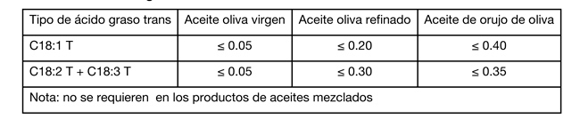 Su contenido de ácidos grasos libres (calculado como ácido oleico) no debe exceder de 0.8 g por cada 100g de aceite, lo que implica que su índice de ácido (hidróxido de potasio) es menor o igual que 1.6 mg/g, y otros índices corresponden con los requisitos fijados en esta norma.