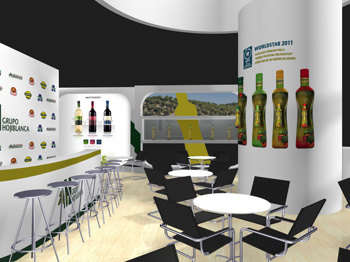 El stand está construido totalmente en madera. El diseño del stand está marcado por la promoción de la nueva botella «Dama» que se presenta en la feria y que será el buque insignia del packaging de la compañia para sus marcas. En la gráfica hemos empleado desde vinilo a lonas microperforadas y hemos creado en su decoración interior zonas destacadas de productos. Se ha creado un suelo de tarima en madera antideslizante. La extensión del stand es de 150 m cuadrados. Os esperamos en su stand. Esta muestra de arquitectura efímera os demuestra el potencial de creatividad de nuestra agencia.