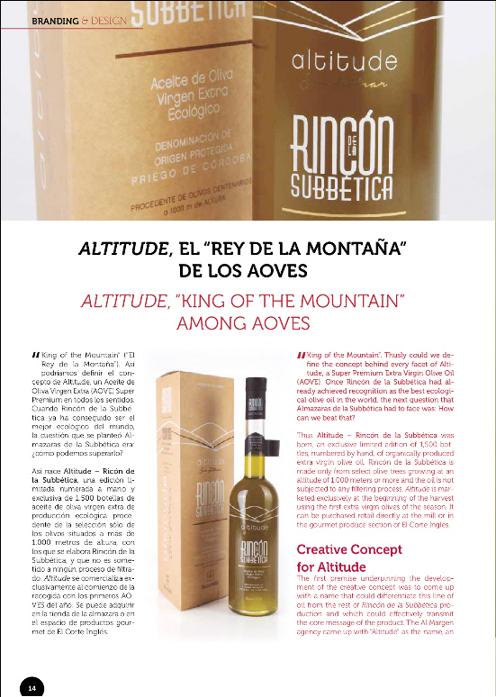 Un concepto creativo de nombre que diferencia a esta gama de aceite de Rincón de la Subbética. En si mismo es un claim de comunicación del producto. El naming de Altitude nace en relación a la altitud de los olivos de los cuales se obtiene y es uno de los factores diferenciadores de este viren extra.