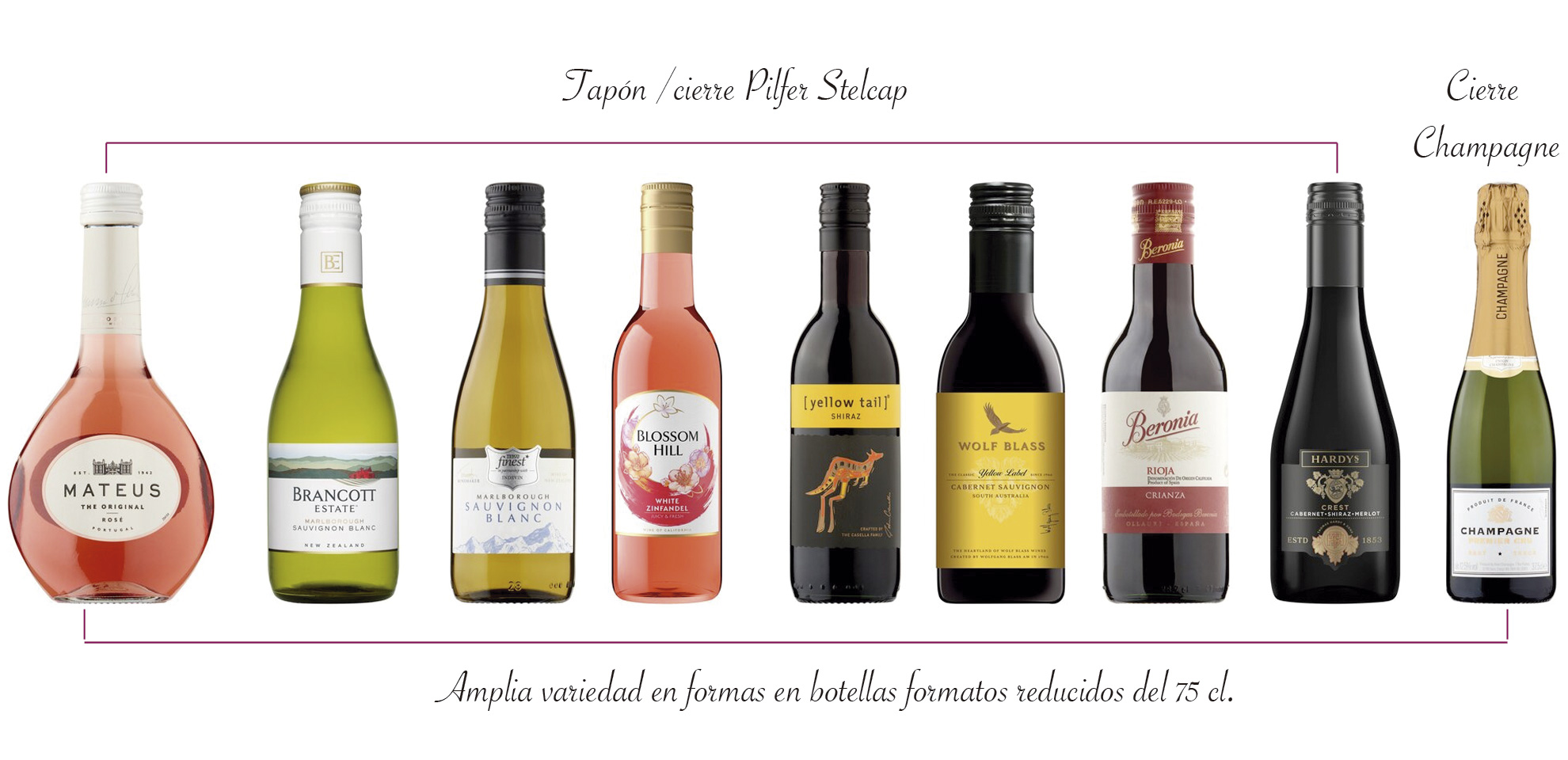 En cuanto a la forma de las botellas encontramos practicamente las mismas formas que en los formatos de 75 cl. con alguna presentación de botella mas exclusiva. Las categorias en vinos en botellas pequeñas son vinos jovenes clasicos, monovarietales, rosados, tintos etc ya existentes en su formato hermano en 75 cl. donde se busca a un consumidor más práctico que prefiere un formato para lo que va a gastar y no tener que guardar la botella con el vino que le sobra. Un formato para uso al momento.