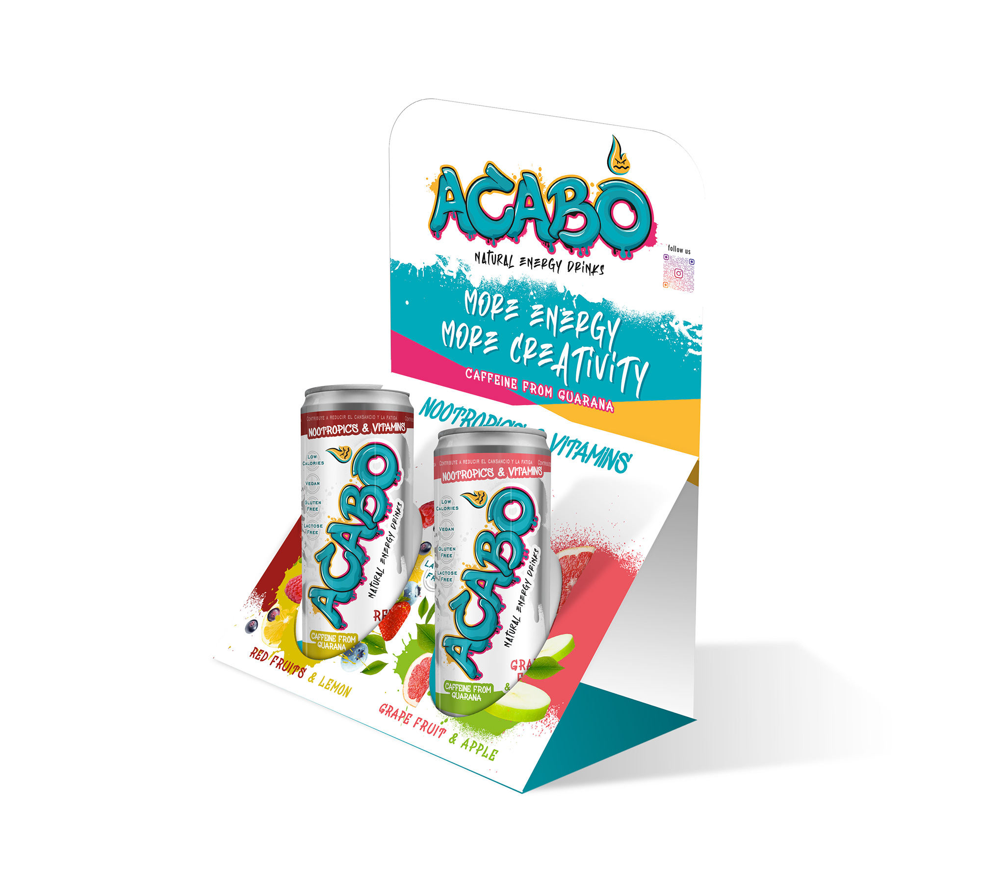 ACABÓ es un packaging de bebidas energéticas naturales RTD. Este segmento está creciendo cada vez más, tanto en categorías de productos como en la banda de consumidores con edad y poder adquisitivo más alto. Este formato de packaging RDT 220 ml facilitará que entre en las neveras de supermercados y se coloque al lado de los artículos de comida para llevar (to go).