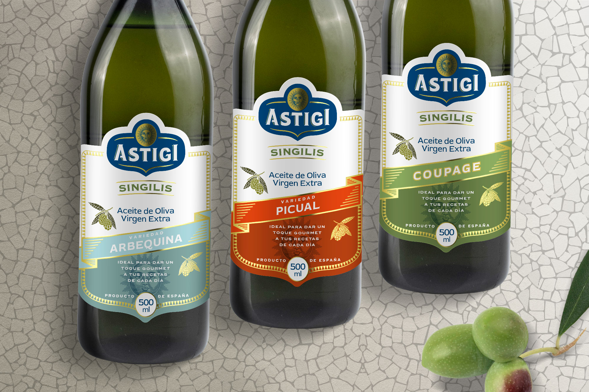 Buceamos en la historia para crear y desarrollar el diseño de toda la gama del packaging de Astigi, desde la línea gourmet convencional "Singilis" hasta el AOVE premium Astigi en vidrio. Las etiquetas reflejan posicionamiento de marca de calidad con tradición, la conexión de el origen de la ciudad Écija y el producto, con un marcado estilo vintage.
