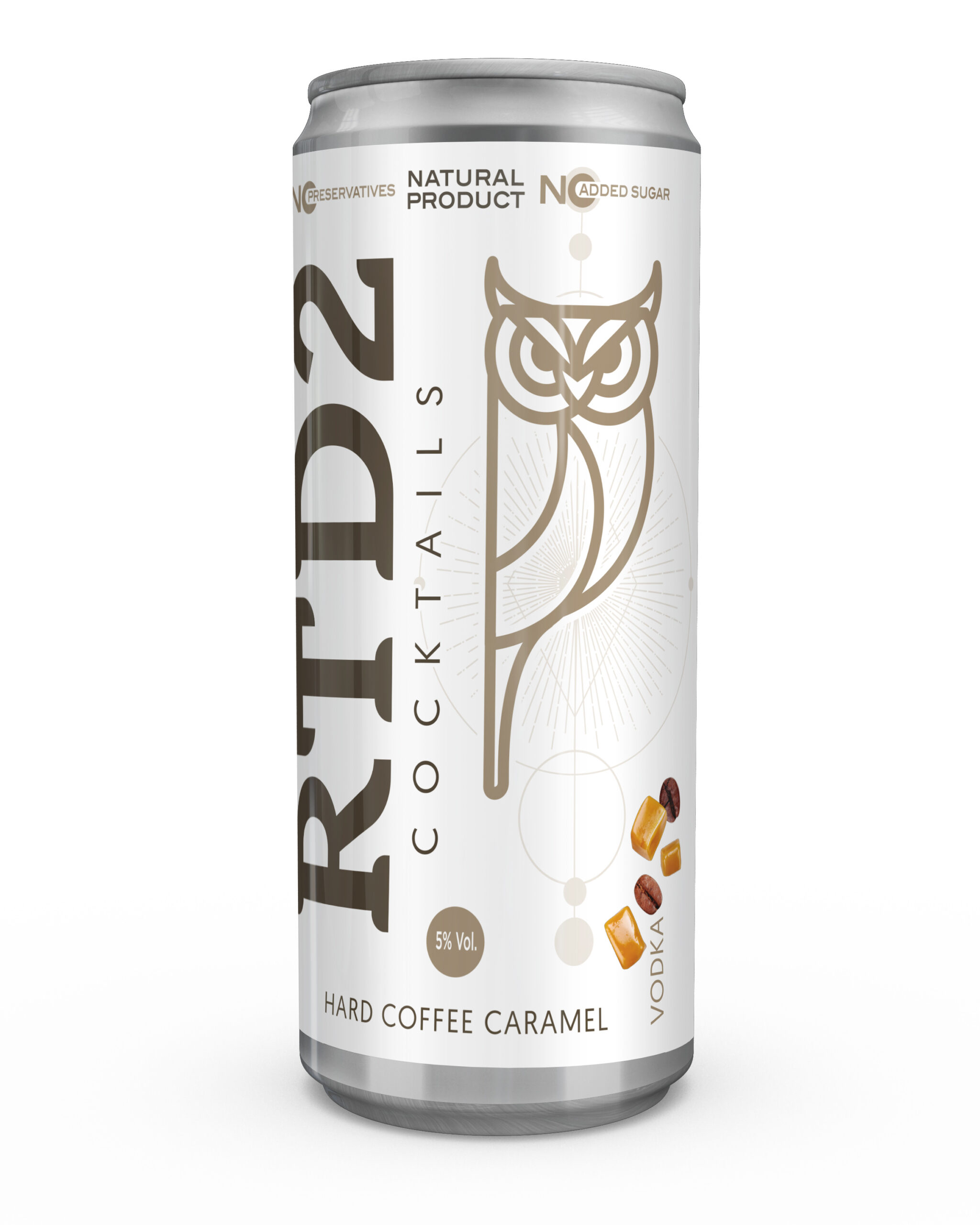 Hard Coffee Caramel refrescante y sabroso con un final ligeramente salado. Los fans del combinado de café y alcohol adorarán este cóctel preparado en frío y combinado con un sutil sabor a caramelo, leche y vodka. El café fuerte con caramelo salado es el ingrediente perfecto para los postres con café y es un excelente estimulante nocturno. Que forma mejor de iconizarlo con un búho y codificarlo con un color unido al animal y los ingredientes.