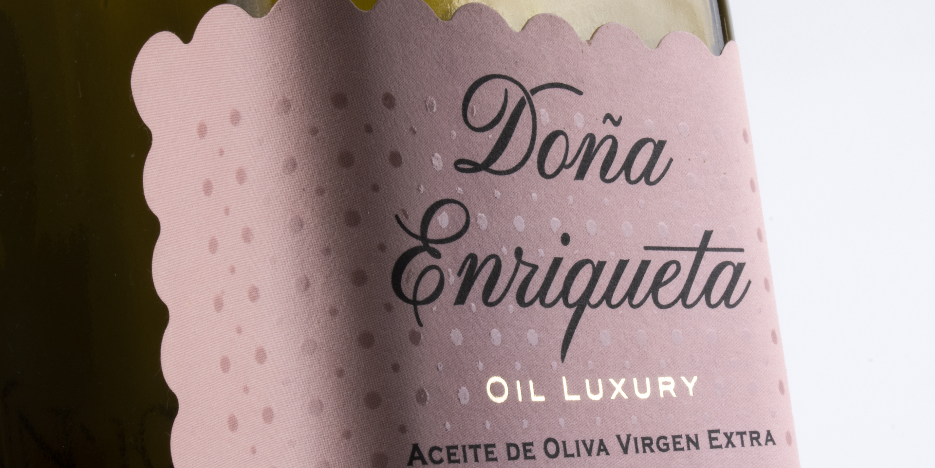 La etiqueta rosa, en apariencia mínimal, lleva una decoración de topos resaltados con UVI brillo, en la que el toque de stamping en oro le aporta un contraste especial.
