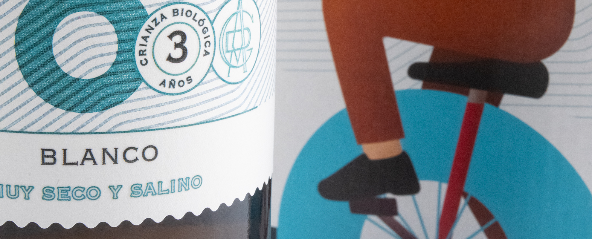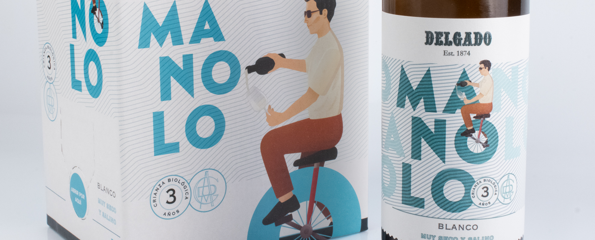 Nuestra idea era dotar de alma al vino Manolo, con un storytelling del que tiramos del hilo de Manolo, creando al personaje e ilustrándolo de manera moderna y haciéndolo montar en la "O" de Manolo a modo de monociclo. El caso era hacer algo moderno, divertido, que al ver la etiqueta nos transmita algo y la recordemos. Además la distribución de los elementos en la etiqueta también es distinta, y el uso de tipografías contemporáneas hace que lo hayamos separado totalmente del mundo de los finos clásicos llevándolo a una línea de vino blanco moderno.