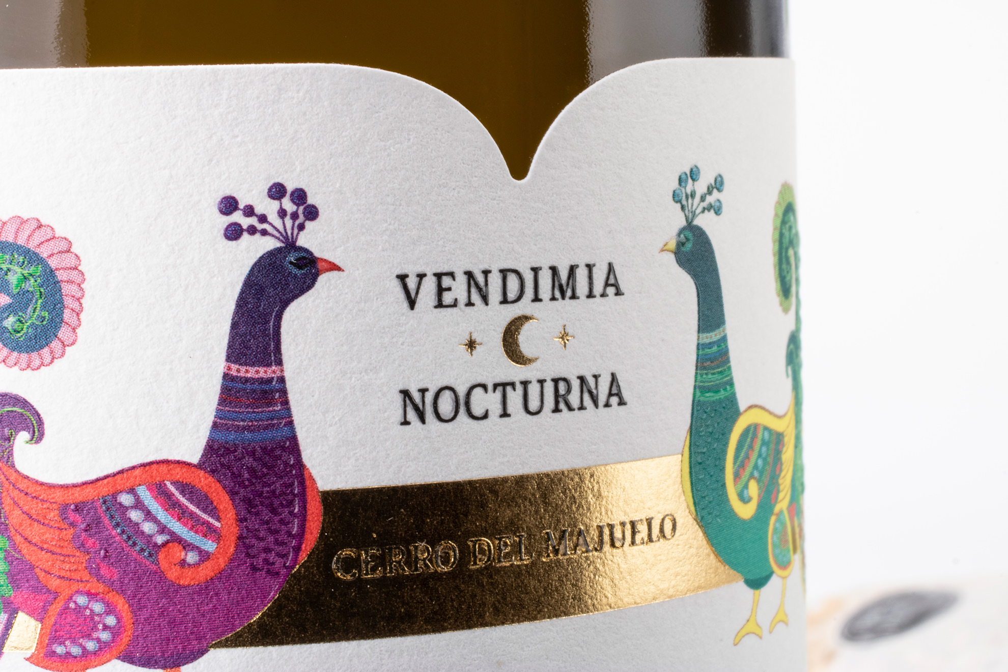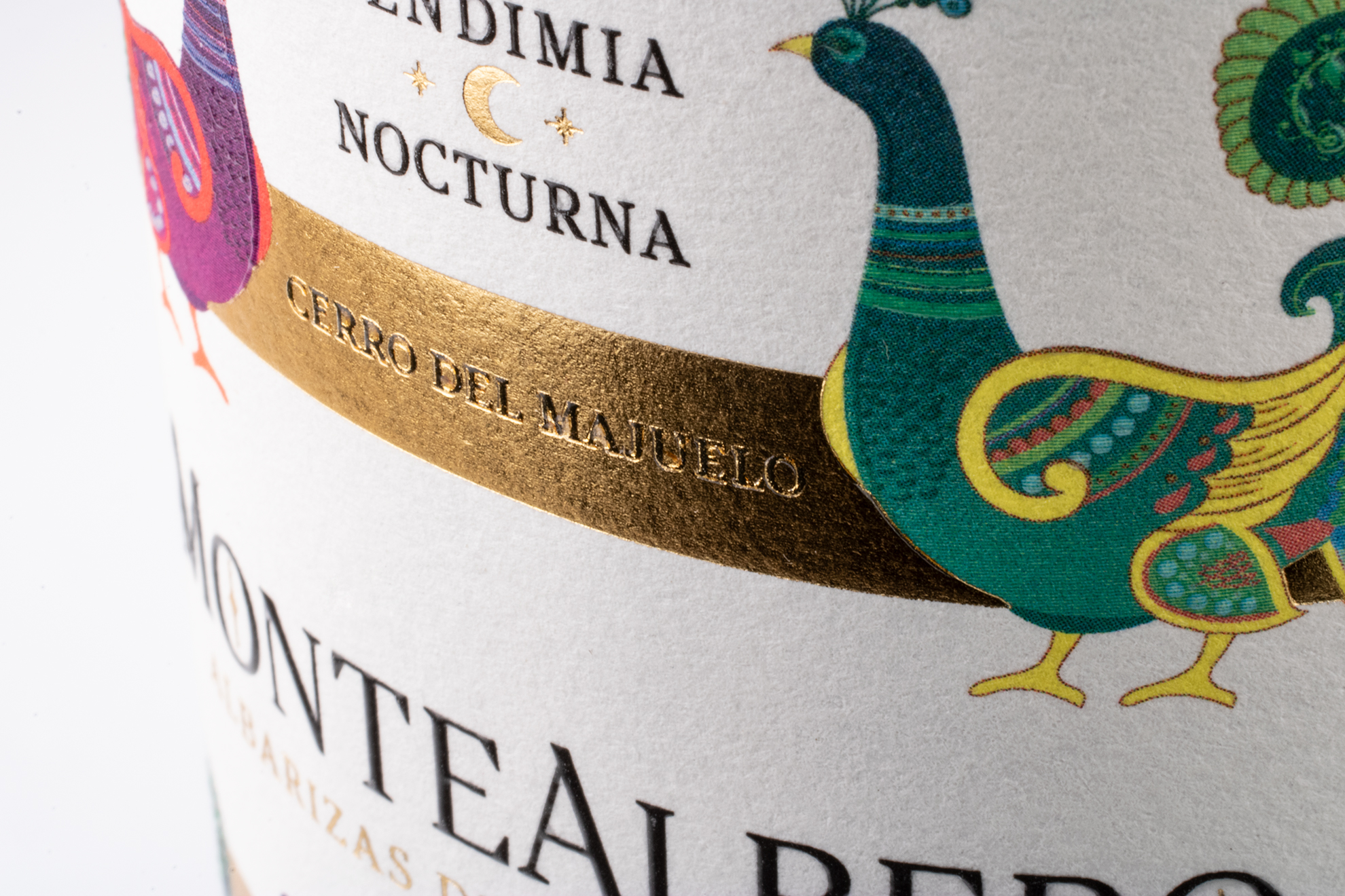 El diseño de esta etiqueta ha sido un proyecto especial por todo el trasfondo que representa. Comenzando por su forma, con suaves líneas curvas, que abrazan a la botella de forma elegante y armónica. Una ilustración original donde las plumas de los pavos reales están conformadas por sarmientos de vid y uvas llenos de vida y de color.