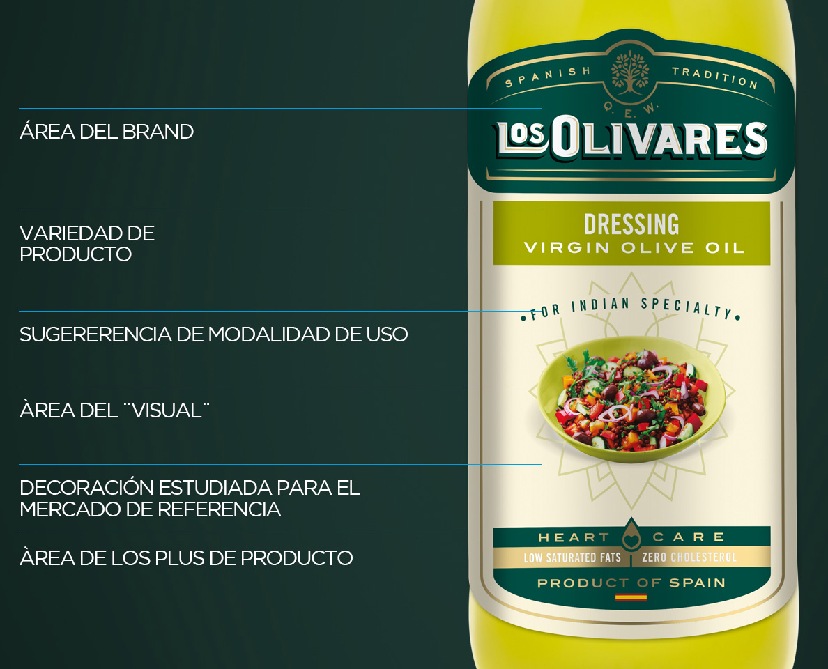 Los Olivares es un branding fuerte y impactante pensado para destacar entre las marcas de los aceites de oliva competidores. El olivo es el símbolo de la marca, icono de los olivares, de los campos españoles. Lo abrazamos con el tagline “Spanish Tradition” que comunica la garantía de calidad de los aceites tradicionales españoles que ya empieza a ser reconocida en India.