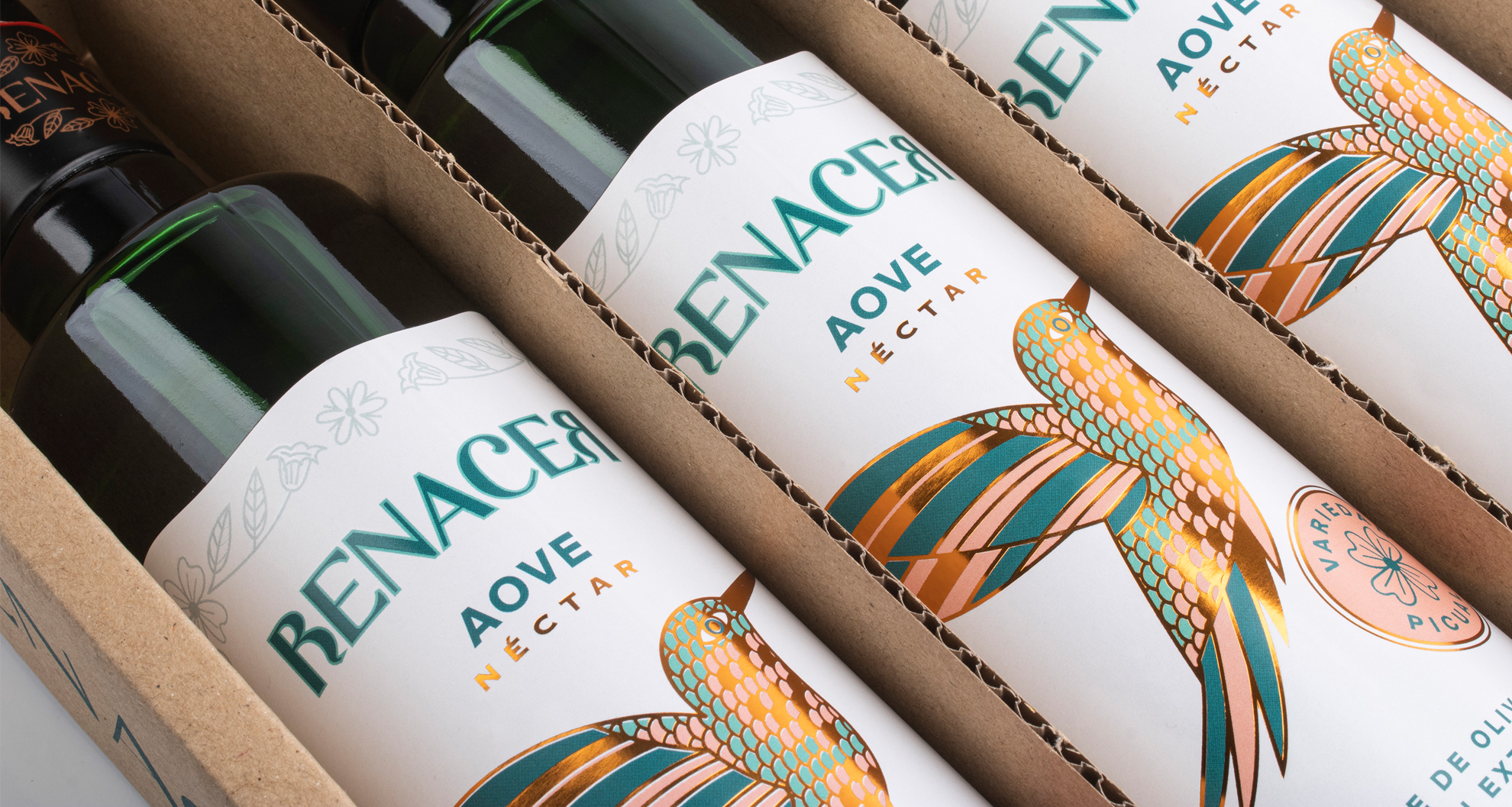 La línea premium Aove Néctar Renacer, tiene una etiqueta con terminaciones muy cuidadas, stamping en frío en cobre con detalles muy finos y barniz brillo. Lo mismo para la línea BIO, que se distingue por un fondo de color verde brillante, para destacar el tema biológico.