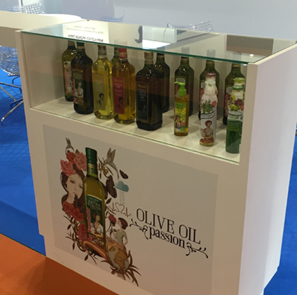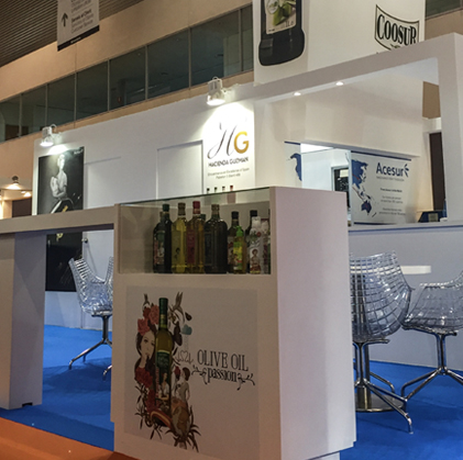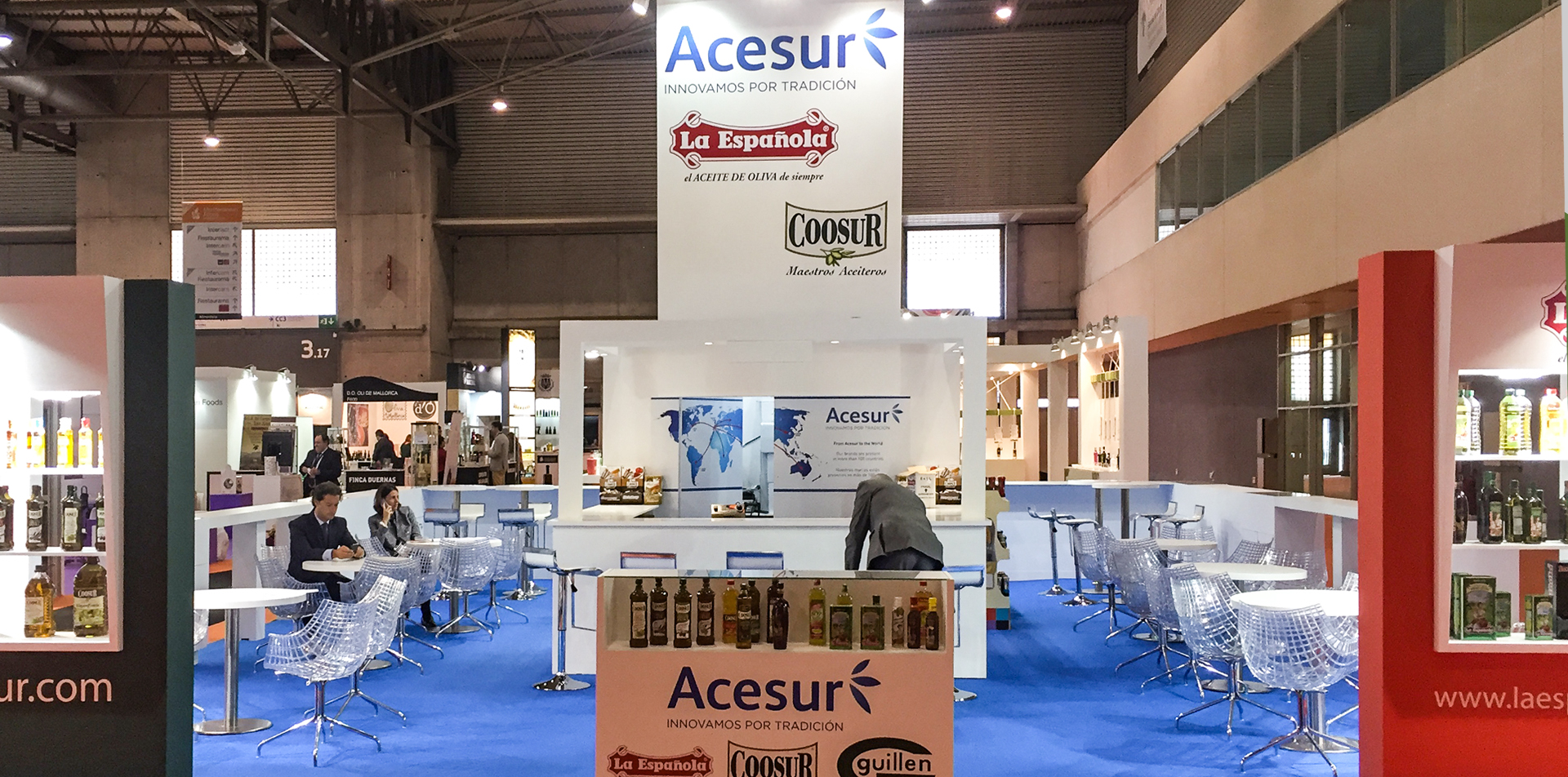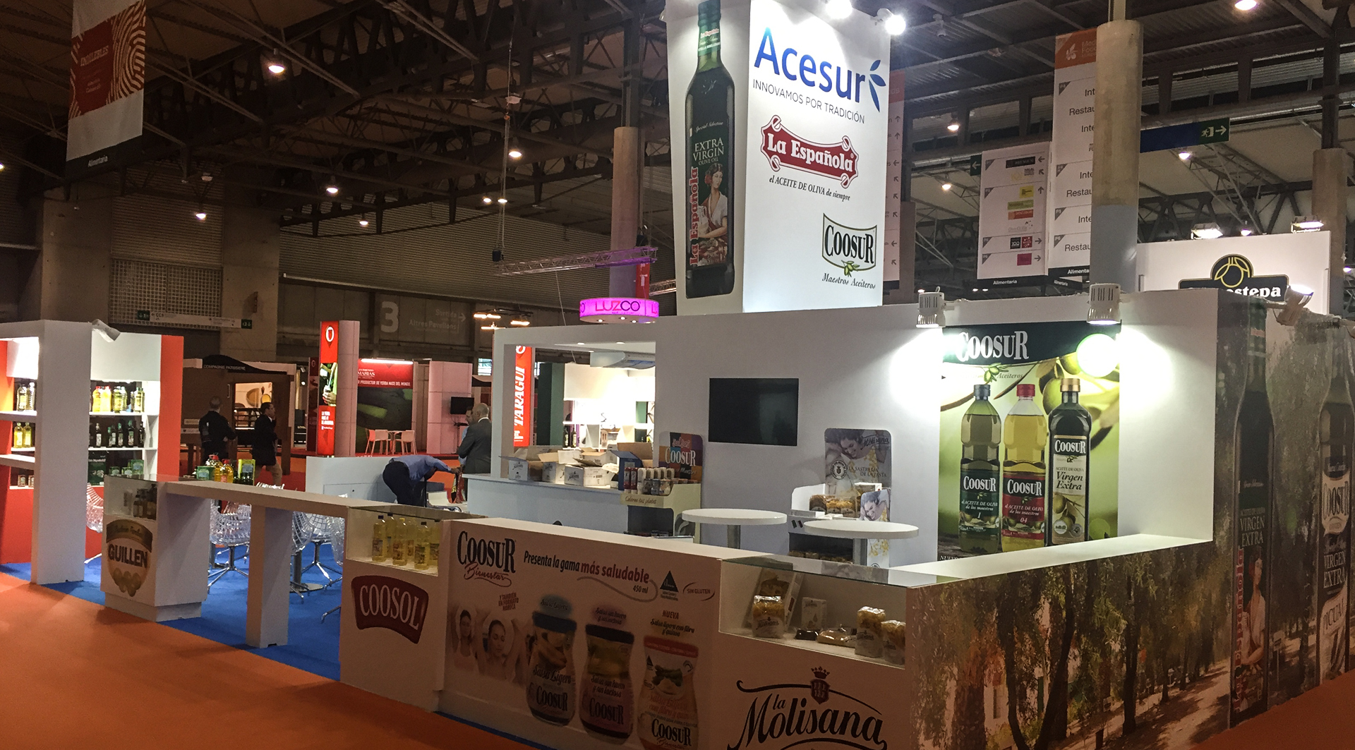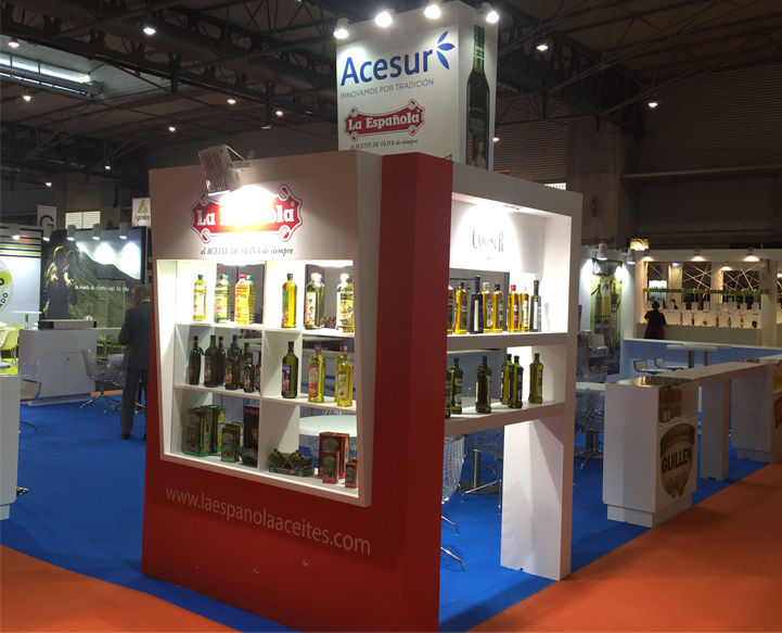 Tener visibilidad es muy importante, por ello en el diseño gráfico del stand incluimos un tótem de 5 m. de altura con un coste notablemente inferior a un trush. Grupo Acesur cuenta con una extensa gama de productos, referencia y formatos en diferentes marcas de aceites y salsas que necesita tener una buena superficie expositora bien organizada y expuesta. Para ello creamos dos córners destacados para las dos marcas principales La Española y Coosur que pudieran alojar todas las referencias solicitadas por el cliente.