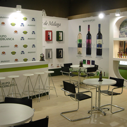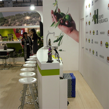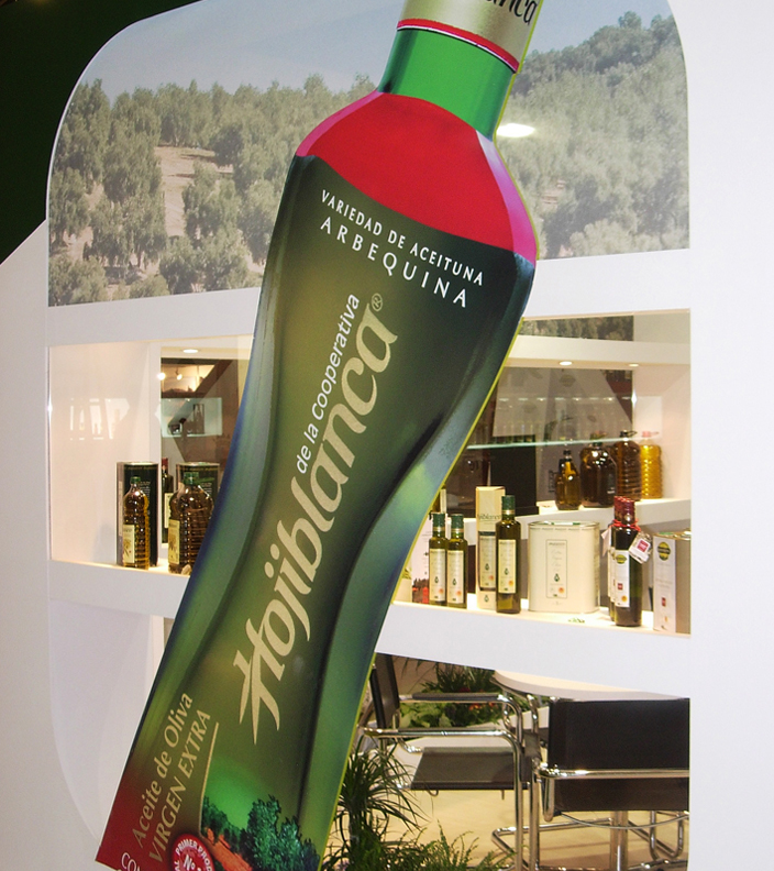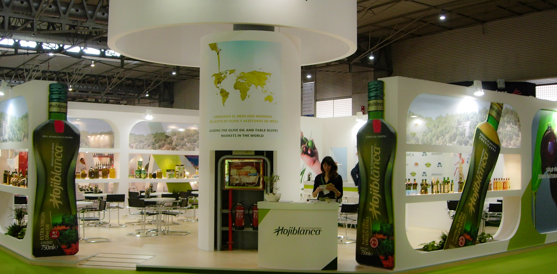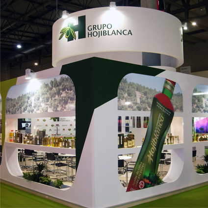 El proyecto de diseño y montaje de stand para el Grupo Hojiblanca se basa en una estructura cerrada pero a la vez ligera en sus elementos con un exterior muy comercial que presenta el lanzamiento de su nueva presentación la botella Dama en sus presentaciones de aove y monovarietales verdial, cornicabra y arbequina. El stand cuenta con una amplia zona comercial diáfana, que está rodeada de los productos expuestos en las vitrinas de exposición que se muestran de cara a la circulación de los pasillos. El problema de la visibilidad del stand está solucionado por la ubicación del mismo y por un trush en forma de anillo suspendido a 5 m de altura.