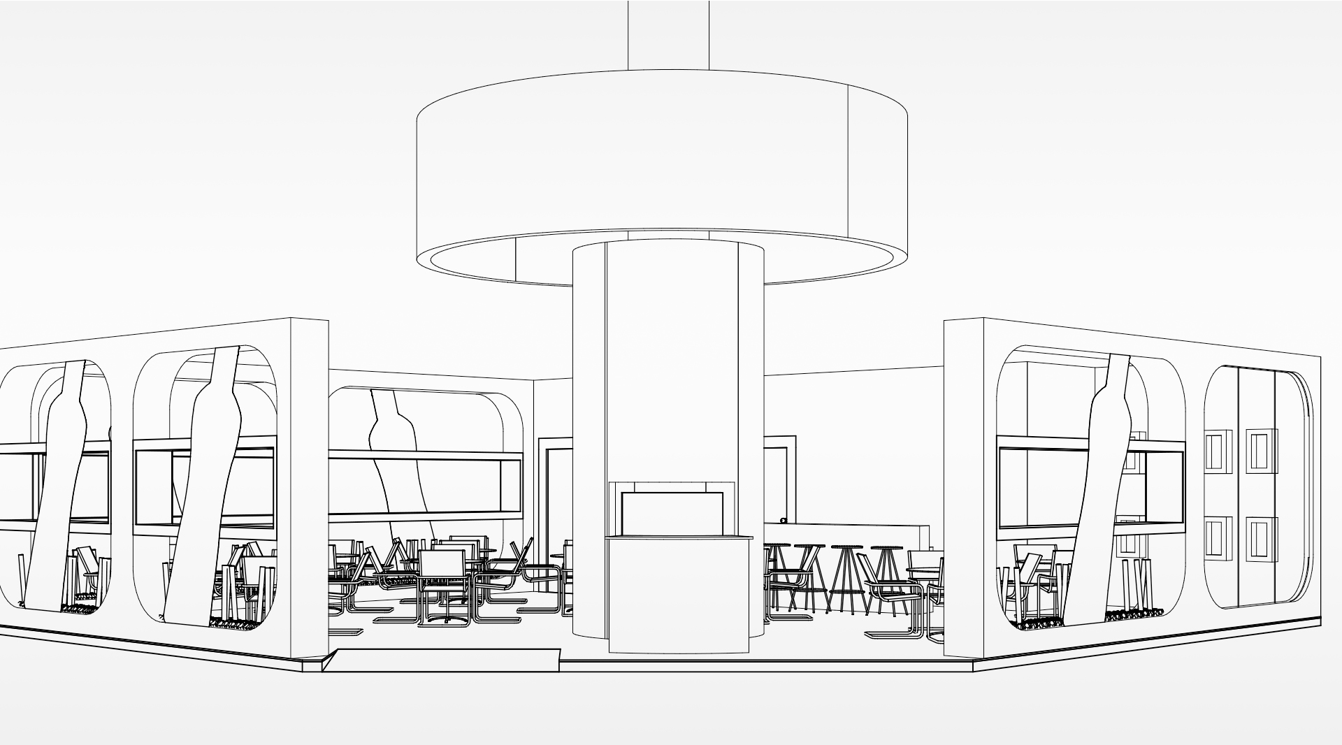 Hemos creado una zona destacada para los vinos de Monte Espejo y Carpe Diem que comercializa el grupo. En el exterior del stand hemos desarrollado los diferentes mensajes de la marca situándolos en función de su prioridad en la comunicación del cliente. La zona interior del stand cuenta espacios específicos; zona comercial y barra de bar, sala de reuniones y almacén.